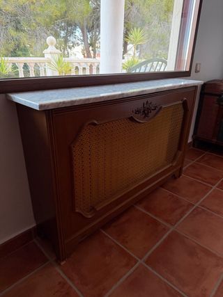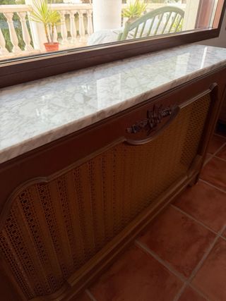Cubre radiador de madera con mármol y ratán