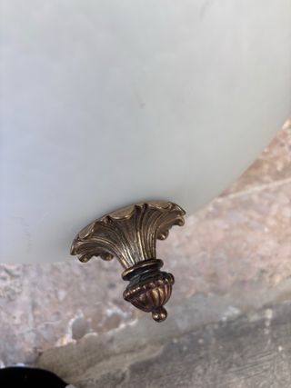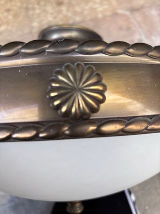 Elegante lámpara con detalles metálicos y un acabado en dorado. Su diseño combina a la perfección con cualquier estilo de decoración. - Cuerpo principal de metal. - Pantalla de cristal. - Adorno floral central.