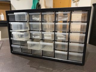 Organizador con 30 cajones transparentes y estructura negra. - Ideal para almacenar piezas pequeñas, herramientas o material de manualidades. - Diseño compacto y funcional.