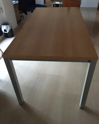 Mesa de escritorio robusta con un diseño moderno. - Tablero de madera en tono marrón. - Patas de metal en color gris. Se pueden desmontar las patas, pero la mesa es grandota, se recomienda venir a por ella con un vehículo con espacio.