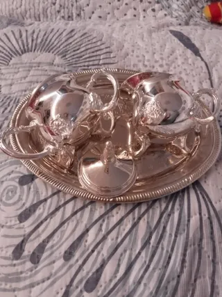 Elegante juego de azucarero y lechera. - Diseño clásico con detalles grabados. - Acabado brillante. - Ideal como pieza decorativa.se vende albal Ribarroja o plaza españa
