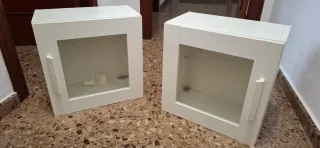 Práctico cubo de almacenaje con un diseño moderno y funcional. - Puerta frontal con panel de cristal. - Acabado en color blanco. - Estantería de cristal en el interior. Tengo dos unidades. El precio es por unidad.