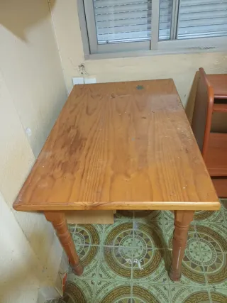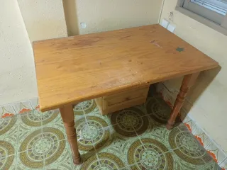 Mesa de trabajo de madera con un cajón. - Patas de madera torneada. - Superficie de madera clara.