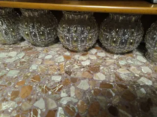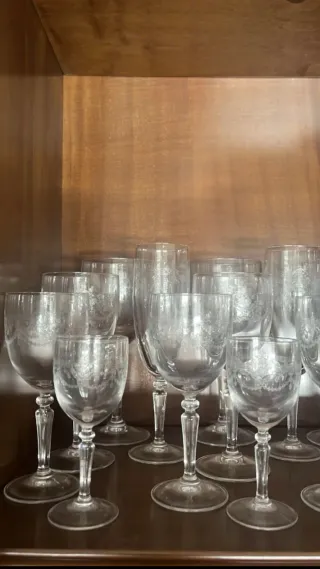 Conjunto de copas de cristal antiguas, nunca utilizadas. Incluye vasos altos y bajos con un diseño grabado. - Diseño grabado floral. - Juego de vasos altos y bajos.