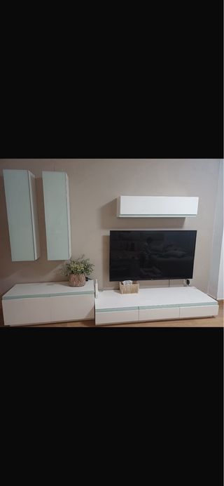 Mueble de salón con un diseño moderno y funcional, ideal para organizar tu espacio. - Acabado en madera con detalles en beige y marrón. - Incluye una estantería superior. En buen estado general Medidas mueble: -Ancho: 185 cm -Fondo: 45 cm -Alto: 40 cm Medidas estantería: -Ancho: 135 cm -Fondo: 25 cm