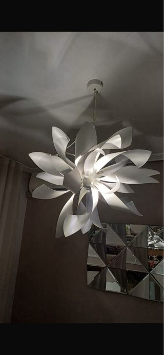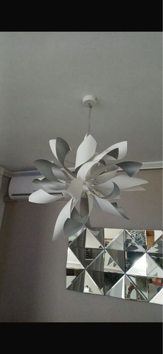 Elegante lámpara colgante con un diseño moderno y llamativo, perfecta para dar un toque especial a tu comedor. - Acabado en plata y blanco. - Fabricada con materiales de metal y papel.