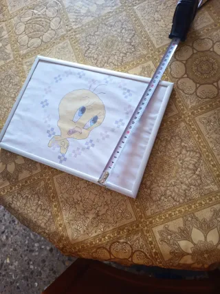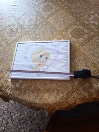 Cuadro decorativo con bordado de Tweety. - Diseño colorido. - Marco blanco.