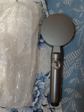 Alcachofa de ducha con un diseño moderno y funcional. Perfecta para renovar tu baño. - Cabezal redondo con múltiples salidas de agua. - Mango ergonómico para un agarre cómodo. - Botón selector integrado en el mango.