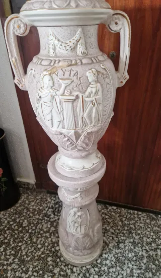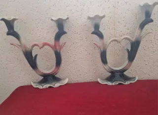 Elegante jarrón de porcelana con un pie decorativo y dos portá velas de cerámica antiguas se encuentra en benetusser