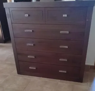 Conjunto de muebles para habitación de matrimonio fabricados en madera maciza. - Diseño elegante con detalles en negro. - Acabado en tono marrón oscuro.