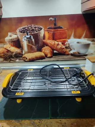 Barbacoa/Parrilla eléctrica Kumtel KB 6000 en color negro y amarillo.Grande. Diseñada para cocinar sin humos ni olores dentro de casa. Se tiene que utilizar con agua.Potencia2200w Más artículos en mi perfil. Solo usada una vez, funciona perfectamente. Sin caja. - Superficie de parrilla metálica. - Asas y detalles en plástico amarillo.