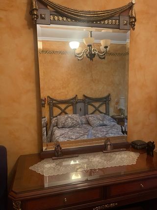 Conjunto de muebles de dormitorio que incluye cómoda, mesitas y cabezal. - Acabado en madera con detalles dorados. - Superficie de cristal en la cómoda.