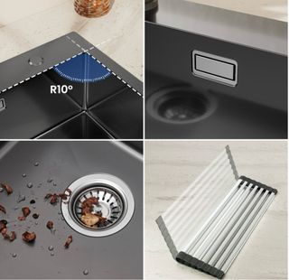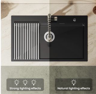Fregadero de cocina de la marca Aurolum, con un diseño moderno y funcional. - Medidas: 75x45cm. - Acabado en color negro con detalles plateados. - Fabricado en metal resistente. He subido las fotos tal cual de la web porque no se ha sacado de la caja. Pvp 200e