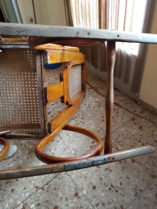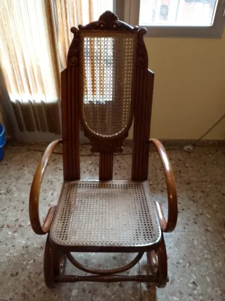 Mecedora antigua con un diseño clásico y elegante. - Estructura de madera. - Asiento y respaldo de ratán tejido. - La mecedora está perfecta solo se partió un balancín i se reparo con metal tal i como se ve en la foto.
