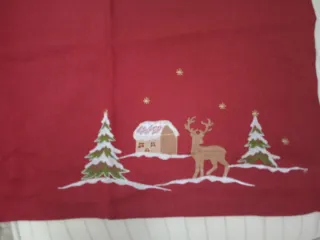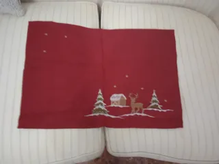 Pequeño mantel con un diseño invernal de Navidad. - Escena de un ciervo, árboles nevados y una casa. - Estrellas doradas dispersas. El dibujo está bordado , tengo más artículos en mi perfil