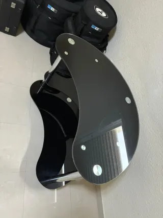 Mesa auxiliar o escritorio con un diseño moderno y elegante. Sus ruedas facilitan su movilidad. - Superficie superior de cristal. - Estructura metálica cromada. - Dos estantes inferiores de cristal negro. - Ruedas para fácil desplazamiento.
