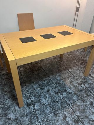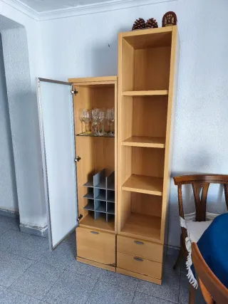 Conjunto de muebles de salón con un diseño moderno. - Combinación de acabados en madera clara. - Puertas y estantes de cristal para exhibir objetos. - Amplio espacio de almacenamiento. Se venden o juntos o separados •precio mesa pequeña; 40€ (54x54) •Precio juego de 6 sillas como las de la foto; 135€ •Precio mesa extensible; 150€ (cerrada 1,30 abierta 1,95) •Juego mesa + sillas; 260€ •Mueble con vidriera; 250€ (alto 2,10x2,81) •Conjunto comedor entero; 560€ Las sillas están en perfecto estado. El mueble tiene un pequeño picado que tengo la pieza nueva de repuesto. La mesa tiene uno de los cristales con una rajita que apenas se ve.