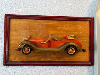 Decoración de pared con un coche clásico tallado en madera. Una pieza única para dar un toque retro a tu hogar. - Diseño detallado de coche antiguo. - Tonos marrones y rojos que combinan fácilmente. - 42x23cm
