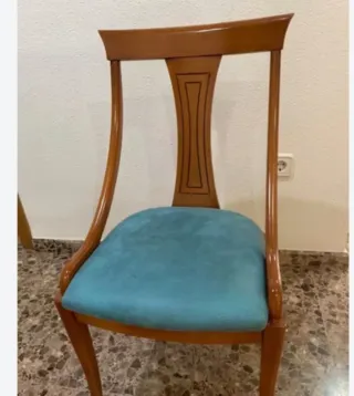 Conjunto de seis sillas de comedor con estructura de madera y asiento recién tapizado en tela color verde azulado. - cada silla 35 euros. - Diseño elegante con respaldo curvo. - Asientos cómodos y renovados.