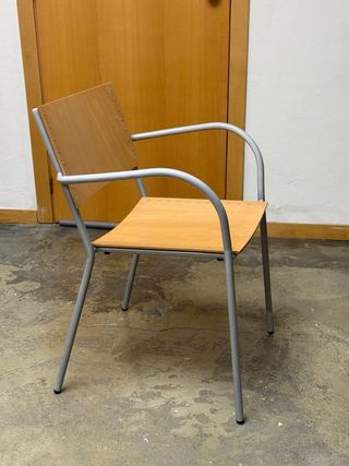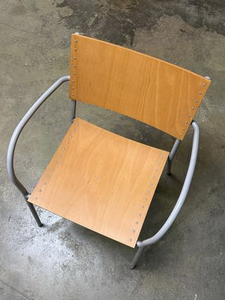 Vendo silla de diseño funcional, muy robusta y cómoda, en buen estado. Características: • 🪵 Asiento y respaldo en madera curvada (una sola pieza cada uno) • 🦾 Estructura metálica tubular en color gris • ✋ Reposabrazos integrados • 🧱 Construcción sólida, pensada para uso intensivo • 🎨 Estética industrial / oficina contemporánea • 📐 Muy estable Estado: • Estructura firme y estable • Madera en buen estado, con ligeras marcas de uso normales.