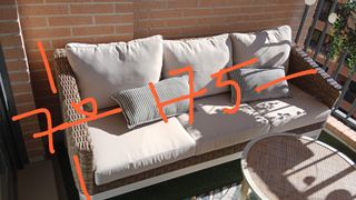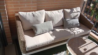 Este sofá de exterior es perfecto para disfrutar de tus espacios al aire libre. Su diseño combina a la perfección con cualquier terraza o jardín. - Estructura de mimbre. - Cojines de tela en color beige.