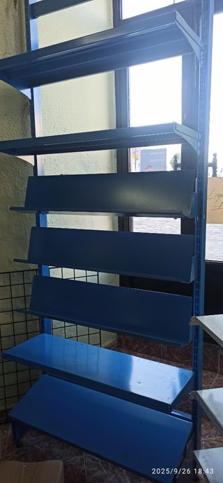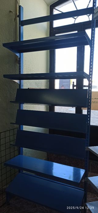 Estantería expositoras de metal. - Estructura robusta. - Diseño de múltiples niveles para exhibición. - Acabado en color azul. Medidas 2.47 de alto, 93 de ancho, 4 baldas anchas 90X 30, 3 reclinables 90X20 y de fondo 38 cm. En total 7 baldas