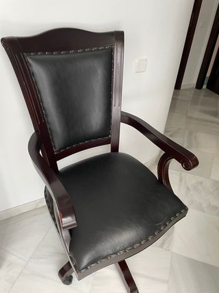 Elegante silla de escritorio con un diseño clásico. - Estructura de madera de calidad oscura. - Asiento y respaldo tapizados en piel negra auténtica. - Detalle de tachuelas decorativas. Tiene un par de imperfecciones como se ve en las fotos pero son mínimas, la silla se encuentra en un gran estado