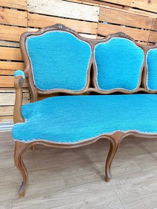 Elegante sofá antiguo que ha sido restaurado con un vibrante tapizado. - Diseño clásico con detalles tallados en la madera. - Tapicería de tela en un llamativo color azul. - Estructura de madera robusta y cuidada.