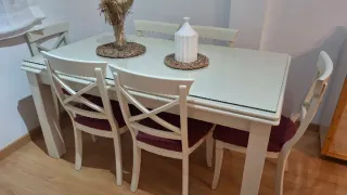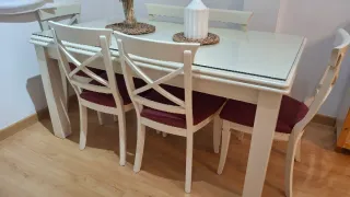 Elegante mesa de comedor con superficie de cristal y estructura de madera maciza y 6 sillas. - Diseño moderno y versátil. - Combina a la perfección con cualquier estilo de decoración. Tiene algunas pequeñas marcas del uso pero está en muy buen estado. Es extensible llegando a medir 280. Cada extensión mide 60 cm.