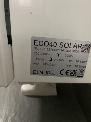 Acumulador de calor Elnur Gabarron modelo ECO40 Solar. - Color blanco. - Diseño moderno y funcional. Se vende por cambio en sistema de calefacción.