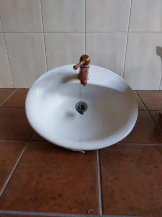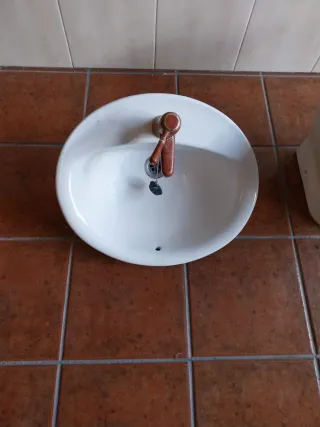 Conjunto de lavabo y bidé en cerámica. - Lavabo de cerámica blanca. - Bidet de cerámica blanca. - Base de terracota.
