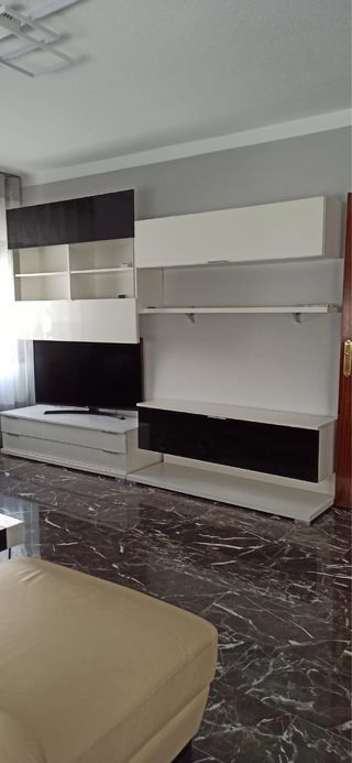 Composición de salón de diseño moderno y buena calidad. - Acabado en blanco y negro. - Mueble bajo con cajones. - Estantes flotantes. USADO EN SEGUNDA RESIDENCIA QUE SE USA SOLO 1 SEMANA AL AÑO.