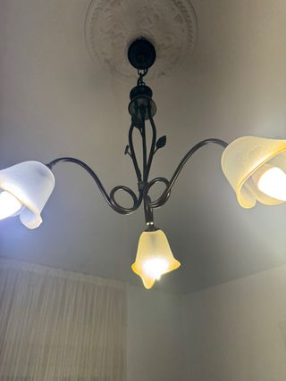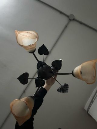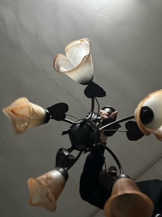 Elegantes lámparas de estilo vintage con un diseño único. - Tulipas de cristal con detalles en tonos marrones y blancos. - Estructura de metal resistente. - Diseño floral. -Son dos una que posee 3 tulipas y otra que posee 5 que funcionan perfectamente las 2 lamparas