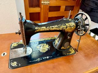 Máquina de coser Singer de principios del siglo XX, con su mesa original. - Diseño clásico en negro y dorado. - Base de madera. - Pieza de colección.