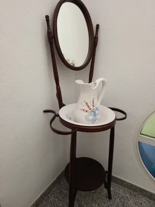 Conjunto de tocador vintage con espejo ovalado y jarrón. - Estructura de madera oscura. - Espejo con marco de madera. - Jarrón de cerámica blanco con detalles florales. - Plato de cerámica para el jarrón. No sé envía es para recoger en casa
