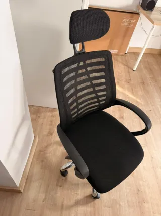 Silla de escritorio con diseño ergonómico y reposacabezas. - Respaldo de malla transpirable. - Asiento acolchado. - Brazos curvos. - Base con ruedas.