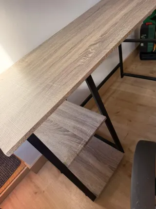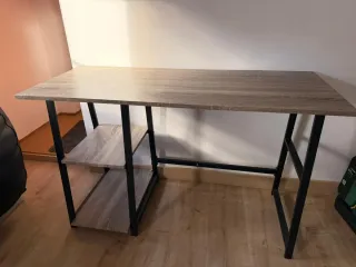 Escritorio moderno con un diseño funcional y elegante. Ideal para tu espacio de estudio o trabajo. - Tablero con acabado en madera. - Estructura de metal negro. - Dos baldas inferiores para almacenamiento.