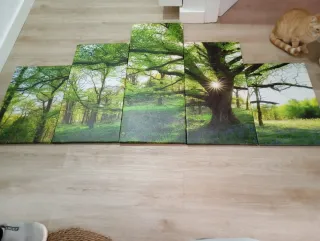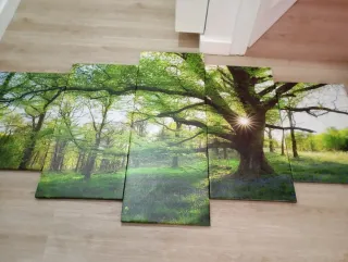 Conjunto de cuadros decorativos con una escena de bosque frondoso y árboles majestuosos. - Impresión sobre tela. - Marco de madera. - Pentáctico
