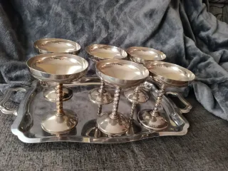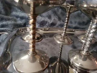 Conjunto de seis copas antiguas de alpaca plateada, es lo que yo creo pero no estoy segura si es alpaca plateada, perfectas para ocasiones especiales. - Diseño elegante con base y tallo decorado. - Acabado brillante y reflectante. Están limpias pero quizás necesite repaso yo las limpio con productos para plata. La bandeja no entra se vende aparte y no es alpaca 20€