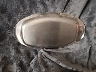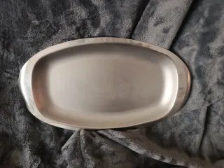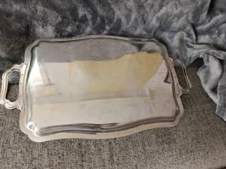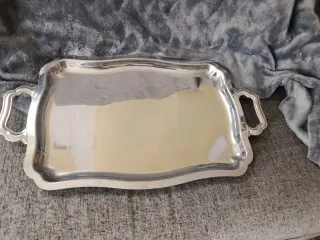 Elegante bandeja metálica con asas, de 49 cm de largo. Su diseño curvo y acabado brillante le dan un toque sofisticado. - Asas decorativas a los lados. - Bordes ondulados. - Superficie pulida. Se aprecia algún arañazo no se si al limpiar se irá pero no se ve porque al hacer foto se refleja como un espejo