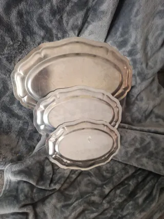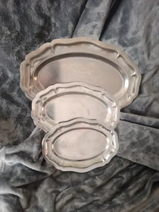 Set de tres bandejas metálicas de diferentes tamaños. Son ideales para servir aperitivos o como elementos decorativos. - Diseño ovalado con borde ondulado. - Tres tamaños disponibles para adaptarse a diferentes usos. La mas grande mide 40 cm mediana 31 pequeña 25