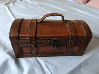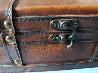 Este es un pequeño baúl decorativo con un diseño clásico. - Mide 22 cm de largo. - Tiene un cierre metálico. - Incluye un asa superior para facilitar su transporte.