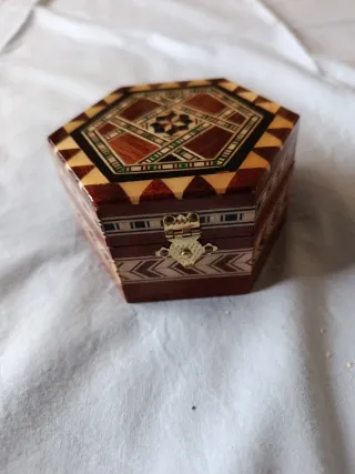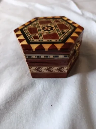 Pequeña caja decorativa con un diseño octogonal y detalles intrincados. - Elaborada con incrustaciones de madera. - Cierre metálico dorado.