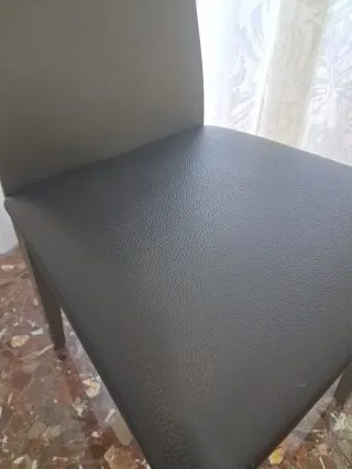 Conjunto de 6 sillas de comedor con un diseño moderno y elegante. Precio por unidad - Patas de madera robusta. - Asiento tapizado en cuero. - Acabado en tonos gris oscuro