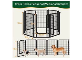 Valla modular para perros u otros animales pequeños. Se puede configurar de diversas maneras para adaptarse a tu espacio. - Paneles de metal resistentes. - Color negro. - Fácil de montar y desmontar. Cuenta con 8 paneles de 100cm de alto x 68 de ancho.