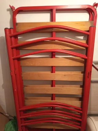 Estructura de cama tipo litera con un diseño moderno y resistente. - Marco principal de metal en color rojo. - Láminas de madera para el soporte del colchón. Cama armario mesita dormitorio lampara casa cocina