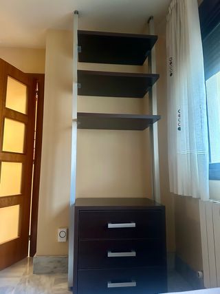 Mueble estantería con cajones de madera, estructura metálica y baldas a modo de estantería. - Diseño moderno y funcional. - Combina madera oscura y metal plateado. - Tres cajones amplios para almacenamiento. - El mueble llega de suelo a techo.