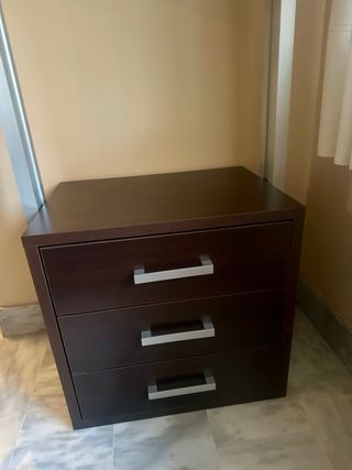 Conjunto de dos camas individuales con colchones (nuevos a estrenar) una mesita de noche y una cómoda. - Camas de madera con somier. - Mesita de noche de madera con dos cajones. - Cómoda de madera con seis cajones.