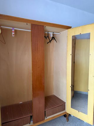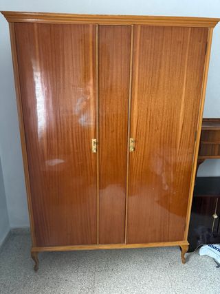 Armario de madera con un acabado en tono marrón cálido. Sus puertas presentan un diseño clásico y elegante. Armario en buen estado Precio negociable - Tres puertas. - Tiradores dorados. - Patas curvas.