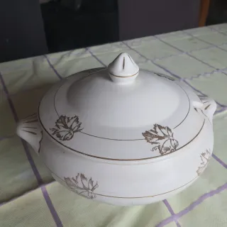 Elegante sopera vintage con un diseño clásico y detalles en dorado. - Fabricada en porcelana de alta calidad. - Acabado en blanco con motivos florales dorados. - Incluye tapa con un práctico pomo.